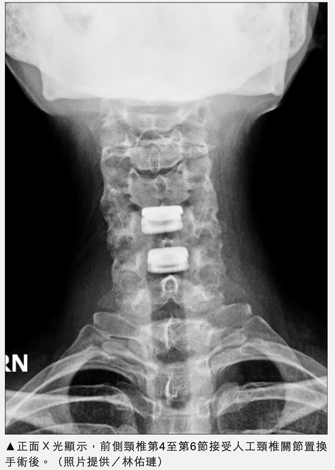 一名36歲台積電工程師因長期於無塵室操作電機配備及電腦,右側持續性的肩膀及右前臂痠麻,更惡化到右手無力。檢查後是頸椎第4節至第6節椎間盤突出造成第4節至第6節右側神經根以及脊隨壓迫。在接受微創頸椎第4節至第6節人工頸椎間盤置換後,術後6小時下床活動,手術後24小時出院,手術後第3天回到無塵室的工作。於手術後3個月在高爾夫球場上揮桿自如。