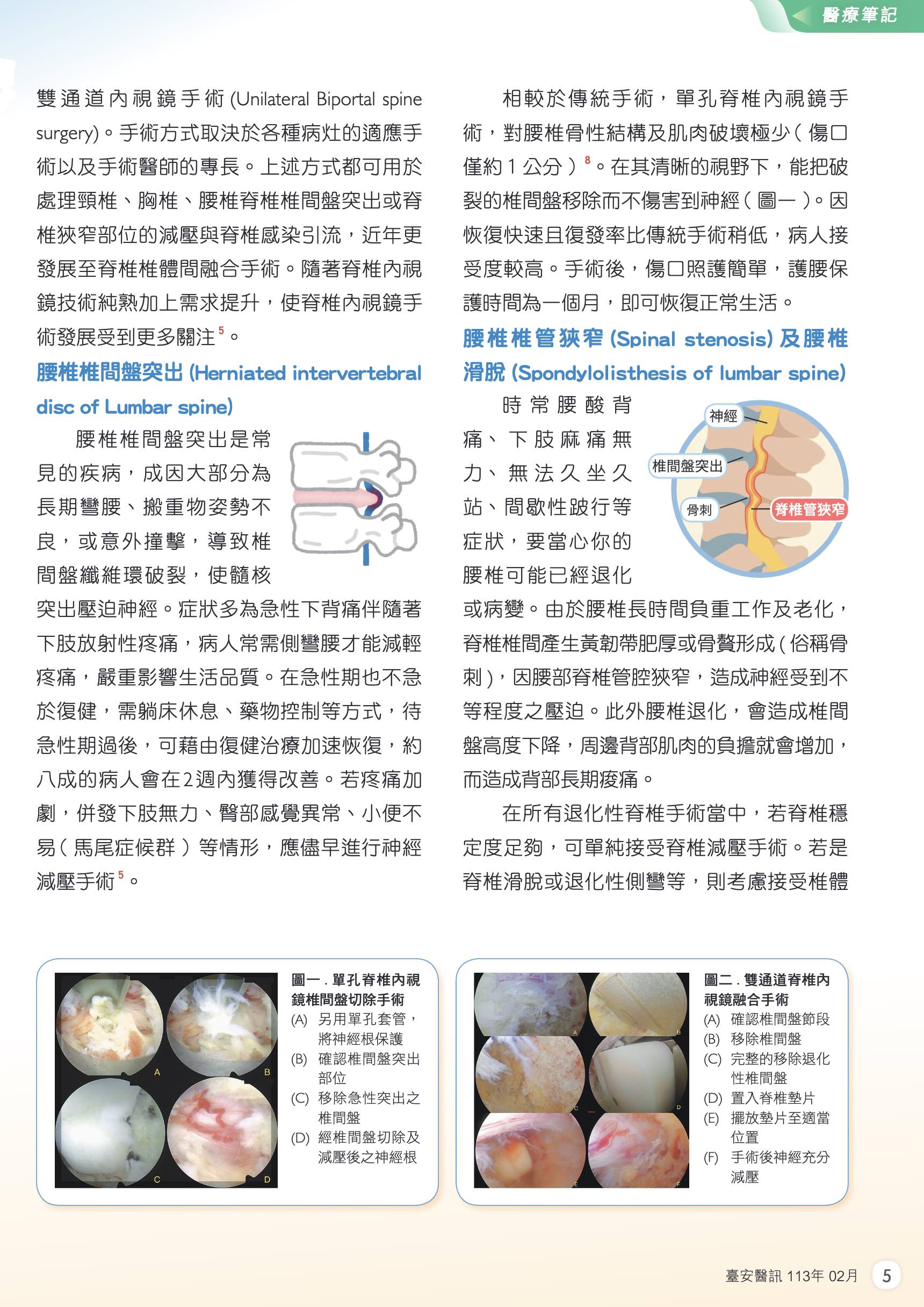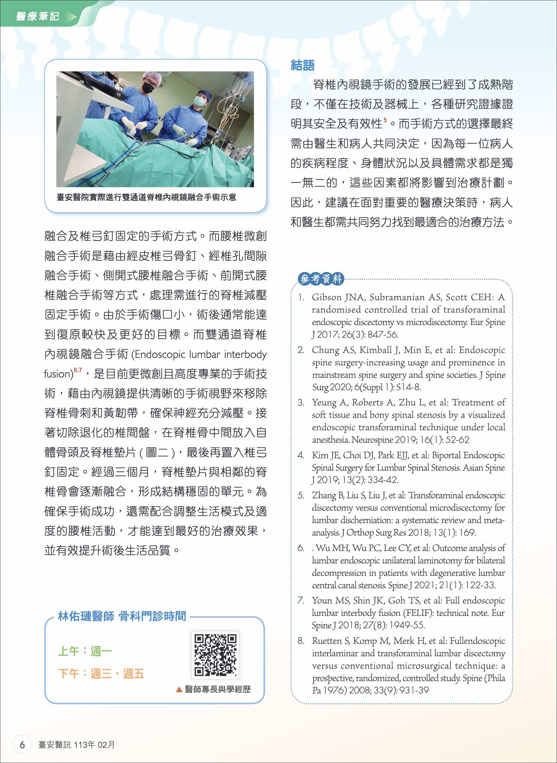 衛教專欄 📅 2024-02-08 👁 瀏覽人次:35 次 新一代脊椎微創手術-脊椎內視鏡手術 脊椎微創手術具備傷口小、恢復快、低併發症等優點。林佑璉醫師為您深度解析單通道 (PELD) 與雙通道 (UBE) 手術技術,助您找回行動力。 對此項治療有更多疑問嗎? 專業骨科診斷需經由醫師理學檢查與影像評估,您可以先行線上留言諮詢,或直接預約門診時間。 留言諮詢 預約掛號